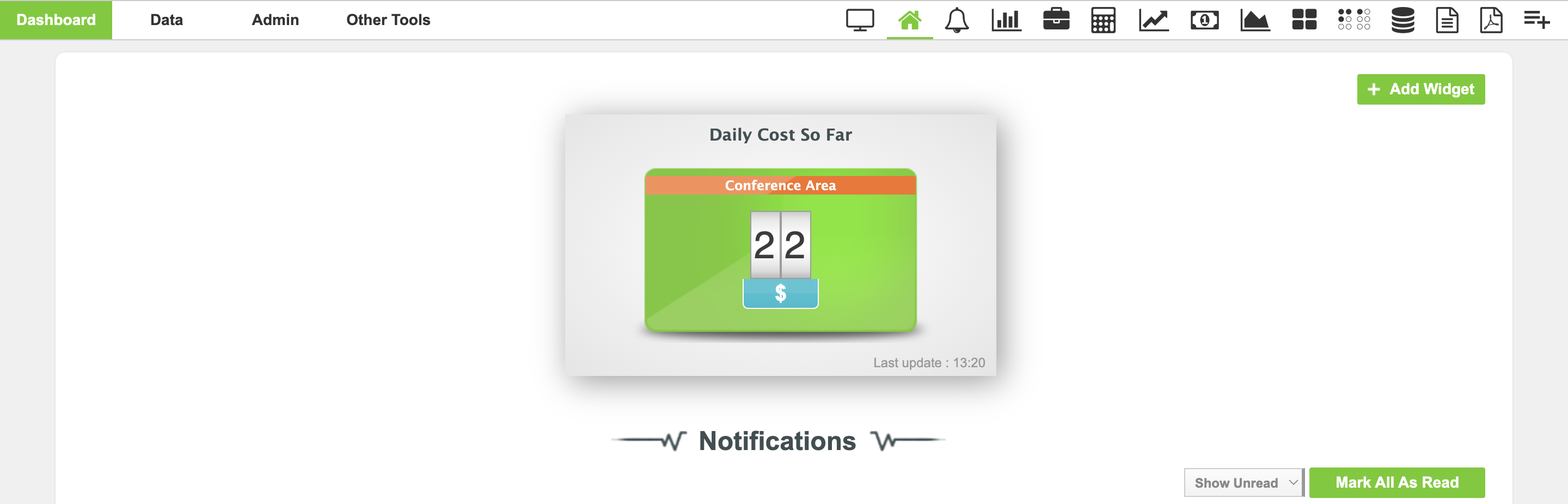 energy in kilowatt hours or cost in the local currency and indicate the period of accumulation, the threshold, and the alert timing. Custom alerts can be made for any numerical data in the system, including gas, water, air quality, CO2, and production.