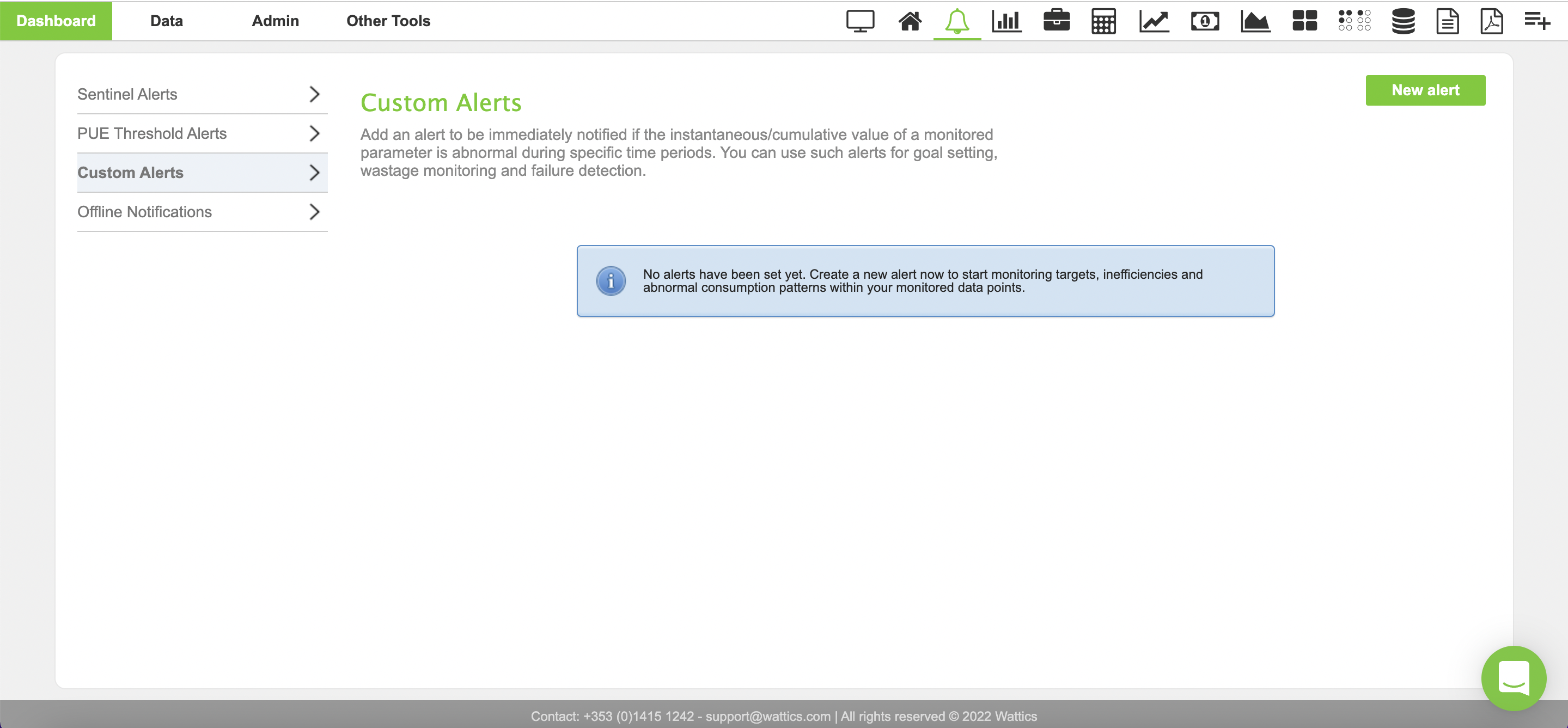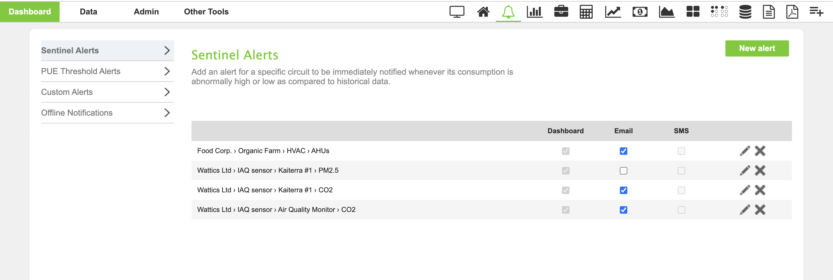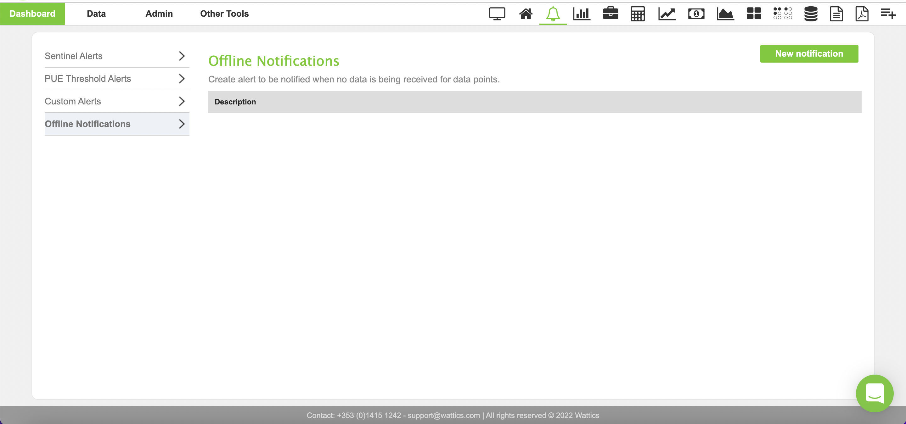 Here, you will see a full overview of the different types of alerts available in the notification settings tool. These features include Sentinel Alerts, PUE Threshold Alerts, Custom Alerts and Offline Notifications. All seen on the left hand side of the image below.