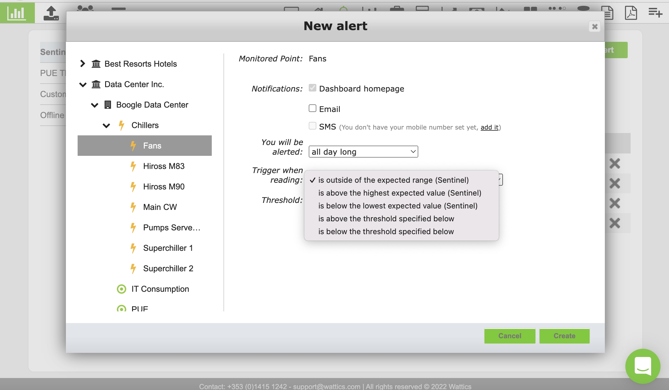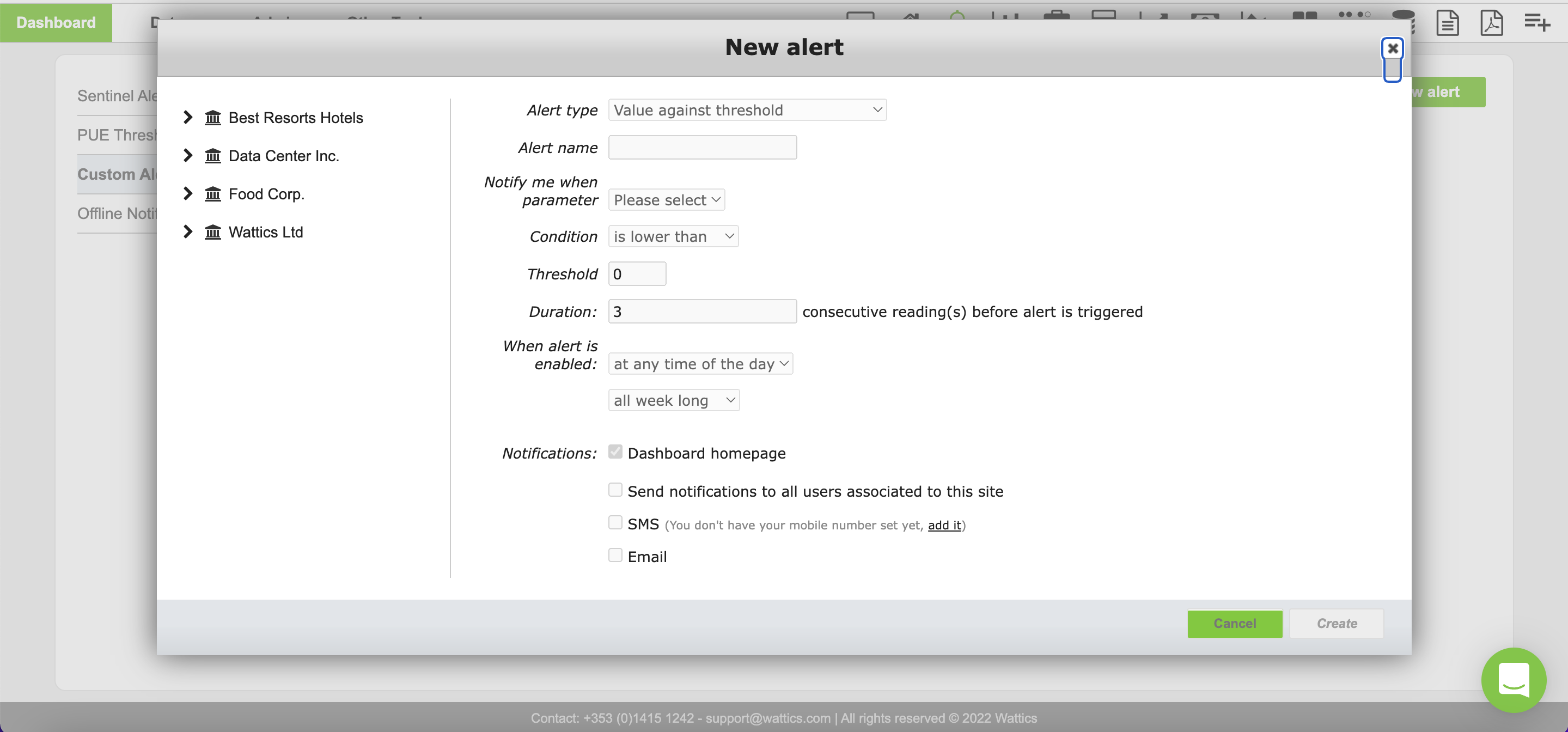 A custom alert can be created to monitor the behaviour of a particular circuit. If we choose ‘value against threshold’, we can set the parameter for the notification, the threshold value, the number of consecutive readings needed to trigger the notification, and the days and times when the alert is enabled.