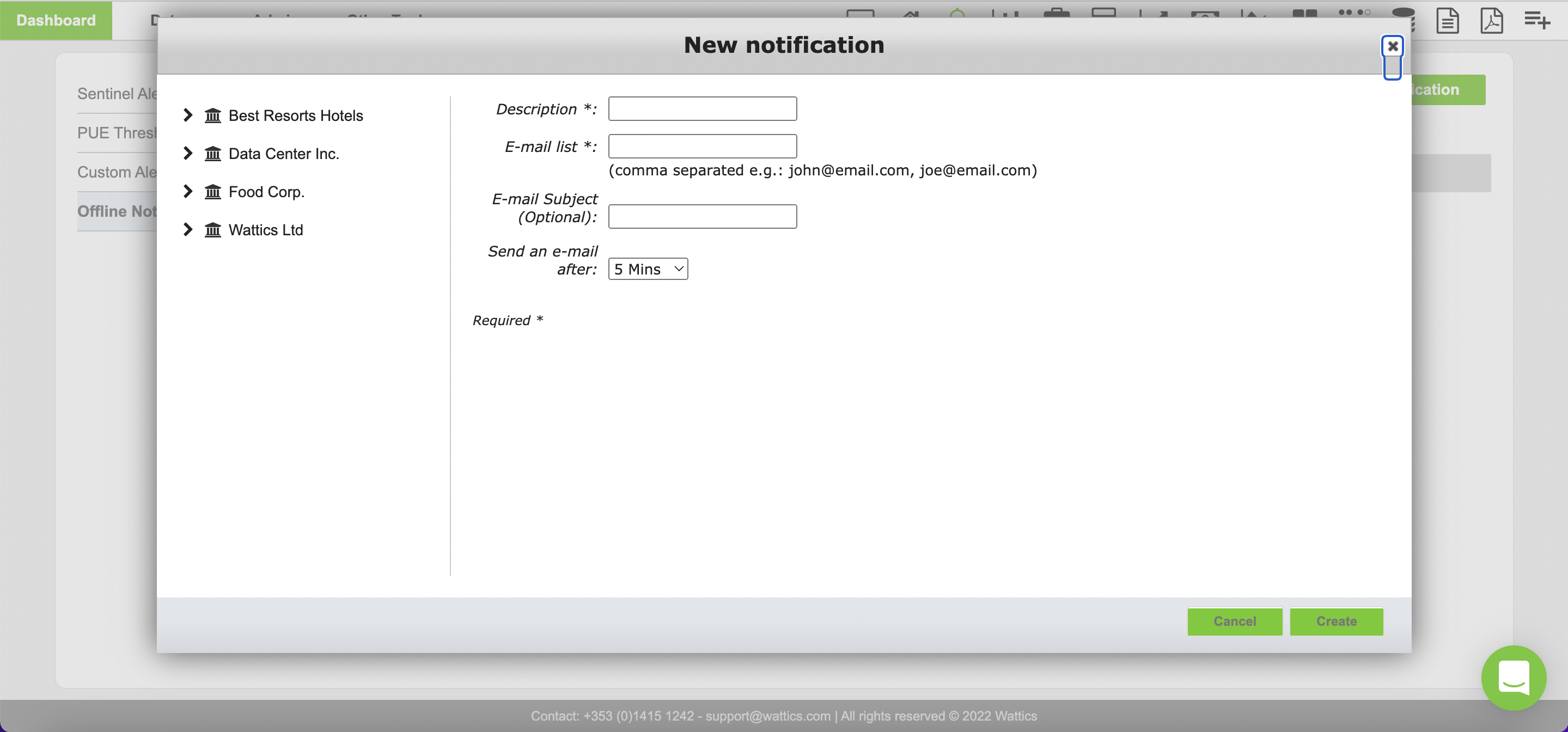 By choosing the site, all monitored points under that site are included in the notification. You can change the amount of time offline needed to trigger an email by clicking on the drop-down list.