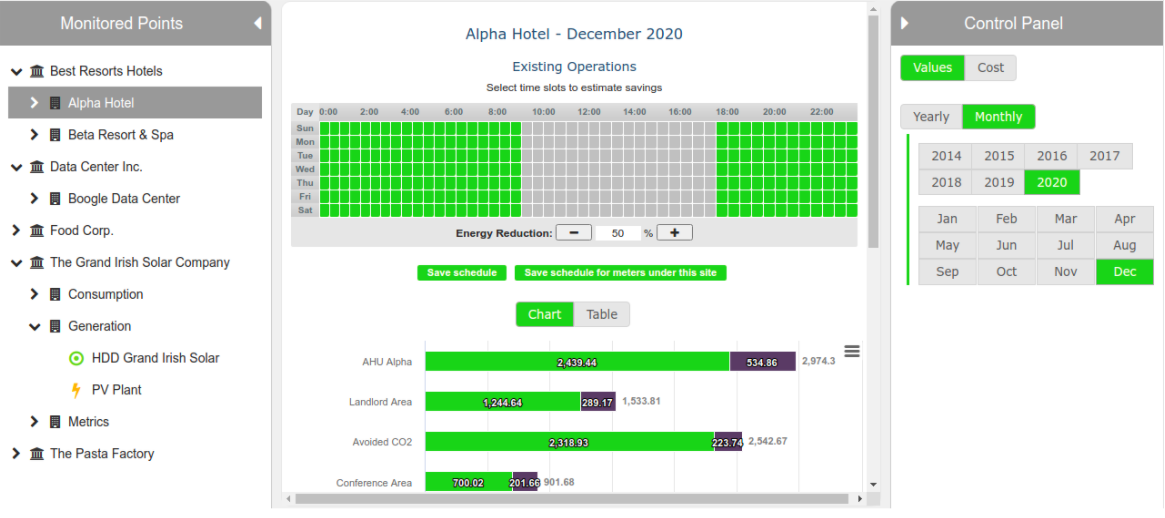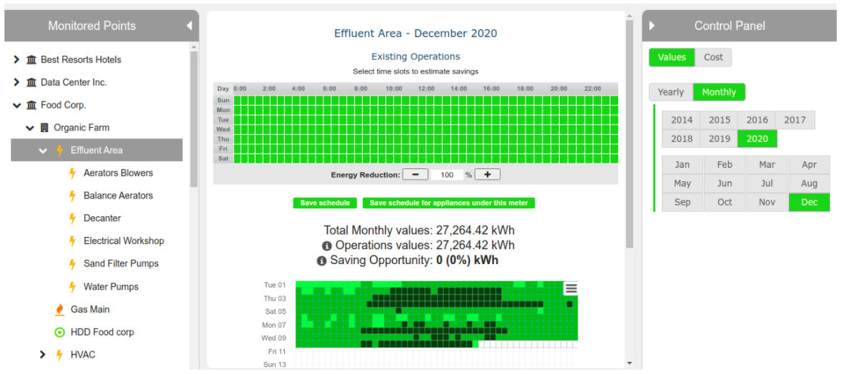 The Operations Analyser enables energy analysts to understand usage and wastage of resources (energy, water, gas, etc). There, it is possible to simulate turning off devices for a period of time in the day or replacing machines, lights or appliances for more efficient ones in a quick way.