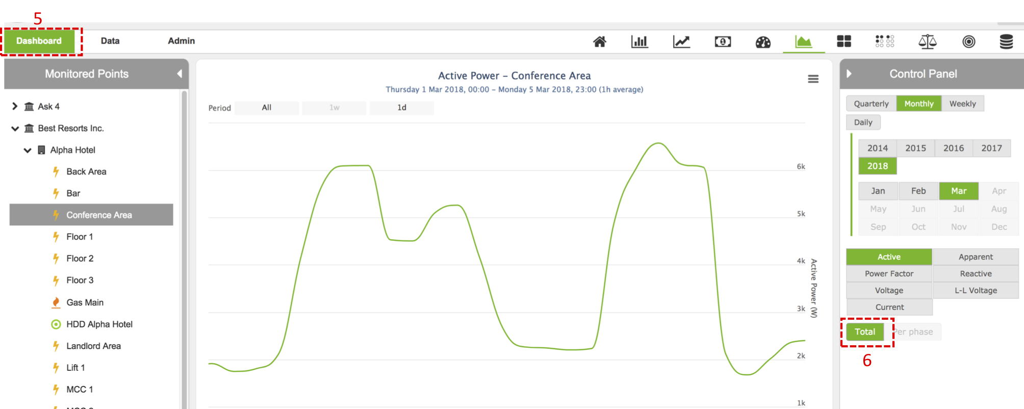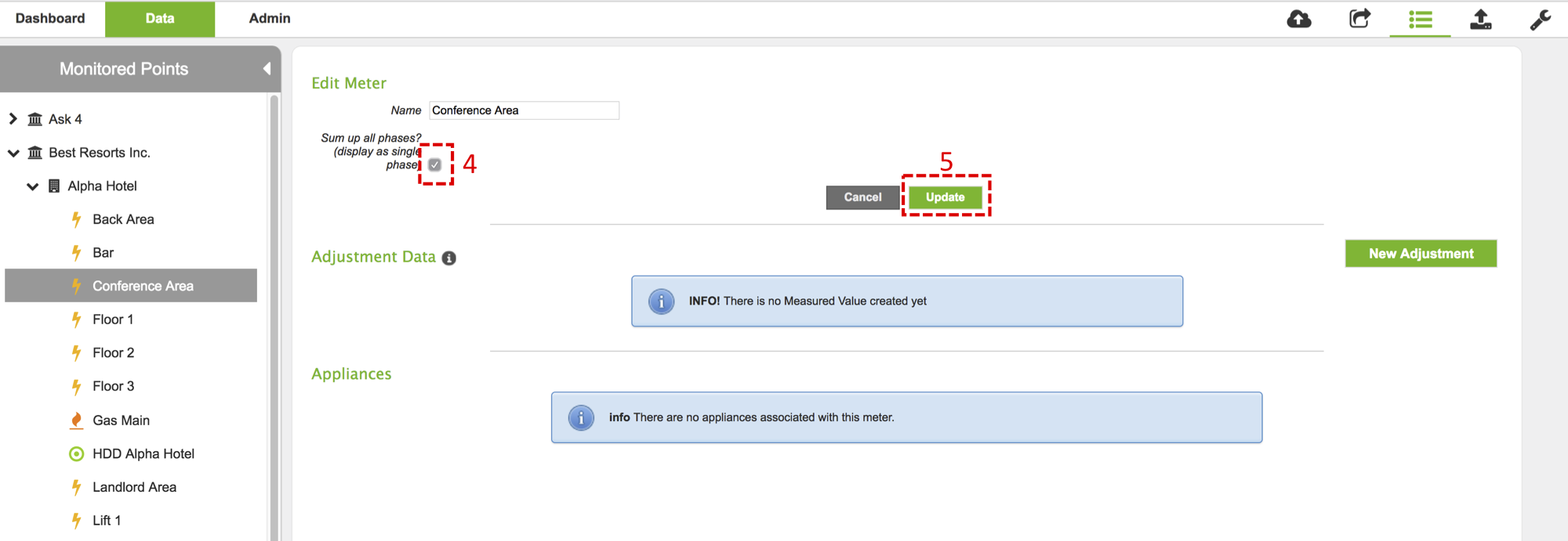In some cases you may want to disable the ability to show each individual phase of an electrical meter and automatically sum the phases of a three-phase electrical meter to show it the total as single phase in the Raw data tab. This is possible by clicking on the "Data" tab, then on "Attributes" and finally tick the checkbox as shown below:
