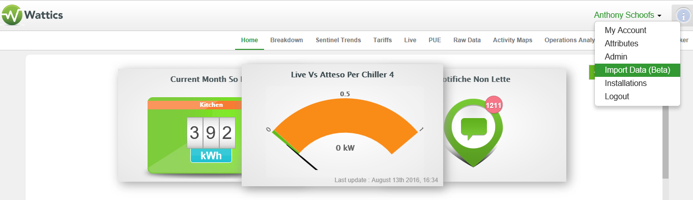 Set up a AiElements Dashboard account on ai-elements.com. Once logged in, click on your name in the top right hand corner of the dashboard to select Import Data.
