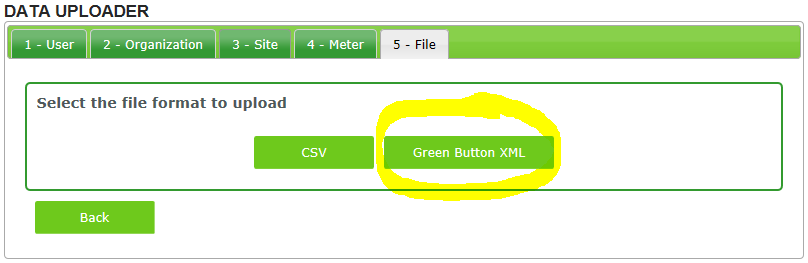 Time to upload your GreenButton file to the system. Click on the GreenButton XML button to get