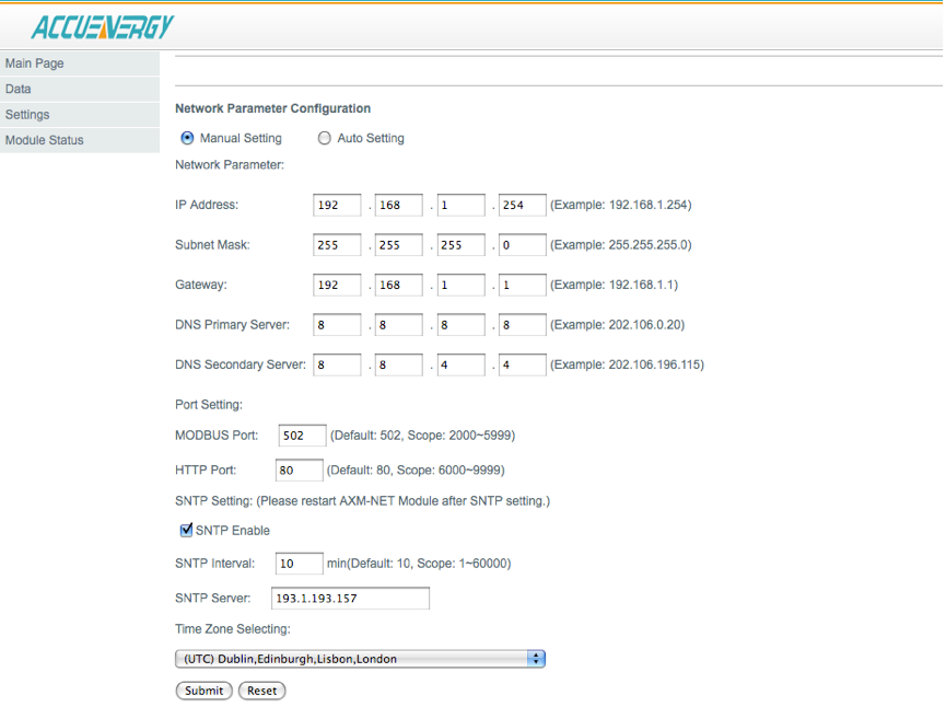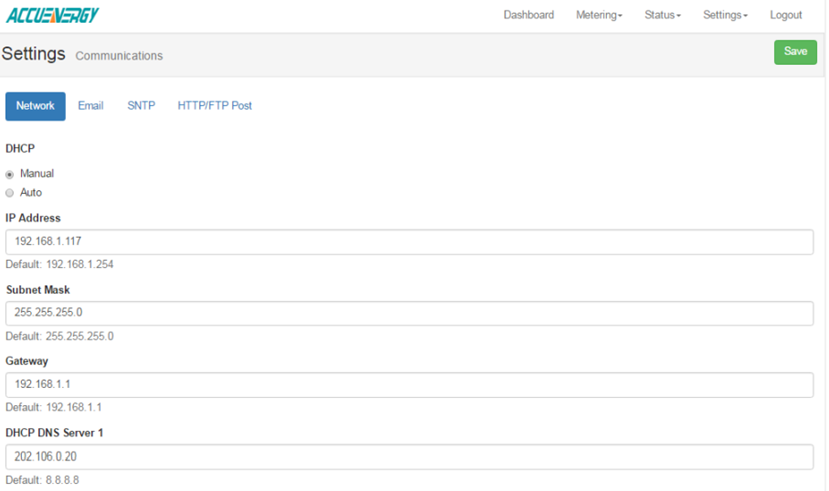 DHCP: Select ‘Manual’ to manually configure the IP address to access the meter. If set to ‘Manual’, you’ll also need to set the Subnet Mask and Gateway. Select ‘Auto’ to have the meter assigned an IP address automatically. With this selection the Subnet Mask, Gateway and DNS servers will also be automatically assigned. Note: After changing DHCP to Auto, check the display of the meter to obtain the new IP address that was assigned.