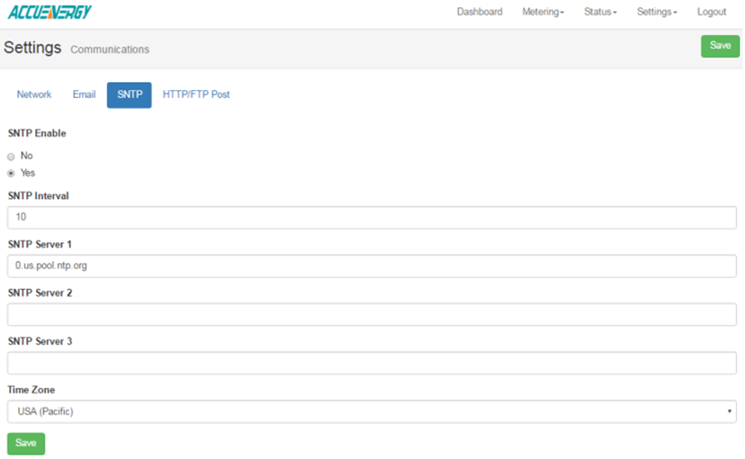 The SNTP function can be configured to allow the meter to synchronize its time with an Internet time server at intervals of time. Click on the ‘Settings’ tab and select ‘Communications’, then select ‘SNTP’.