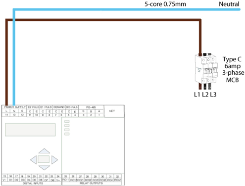 Wire the meter voltage reference inputs to a Type C 6AMP 3P breaker to provide voltage reference for power calculation. Make sure the breaker is in the OFF position.