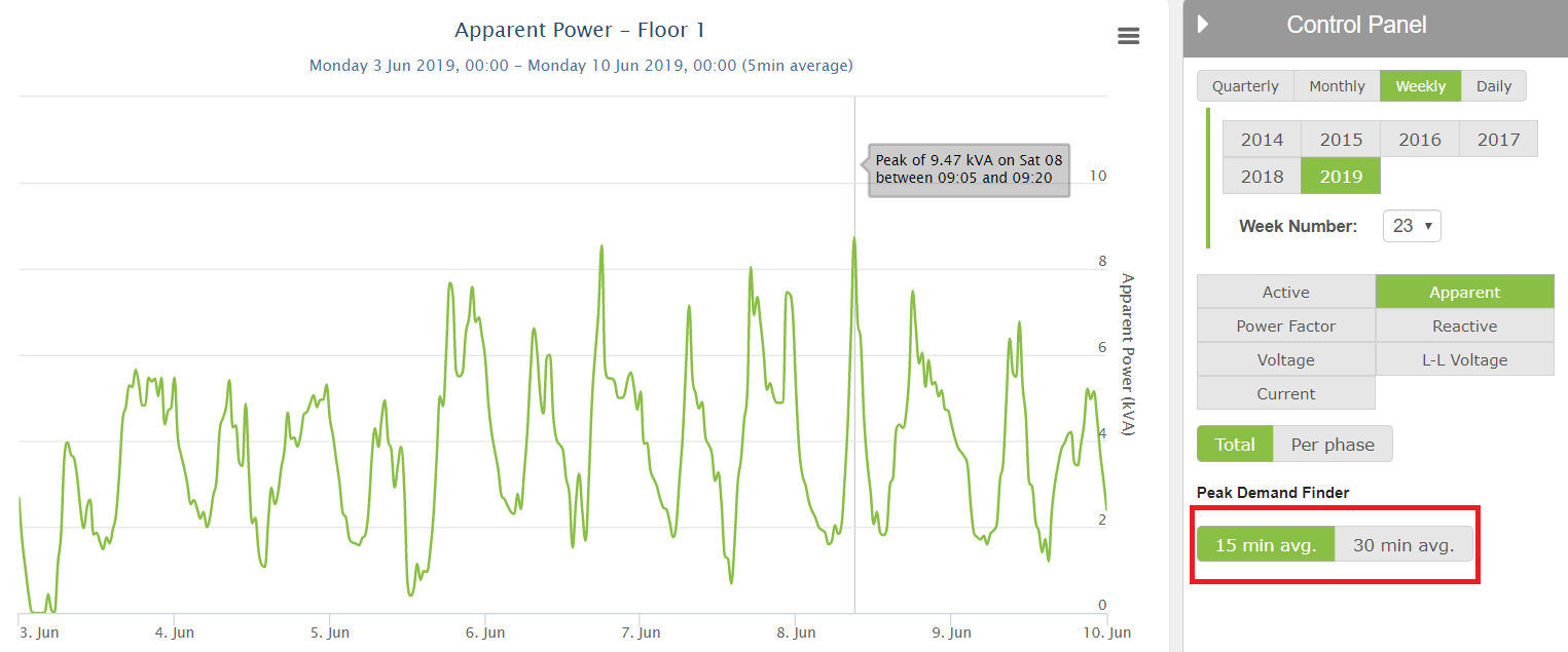 The peak demand finder tool will display kW/kVA values as well as the date and time window that peak demand was at its highest.