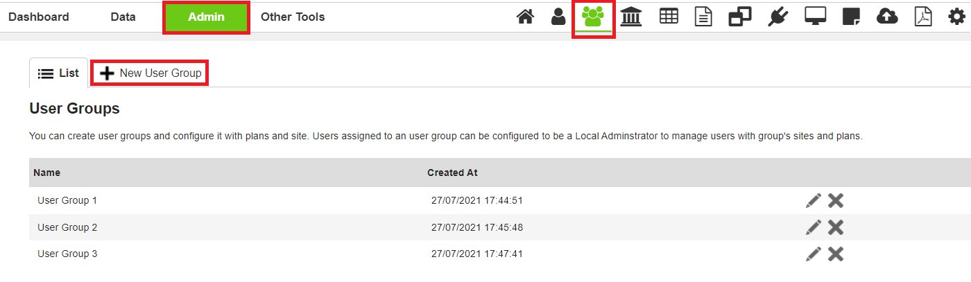Once you have created your user groups, you can view, edit, and delete user groups found in the list of user groups created, in your Admin Tab, as shown in the screenshot below: