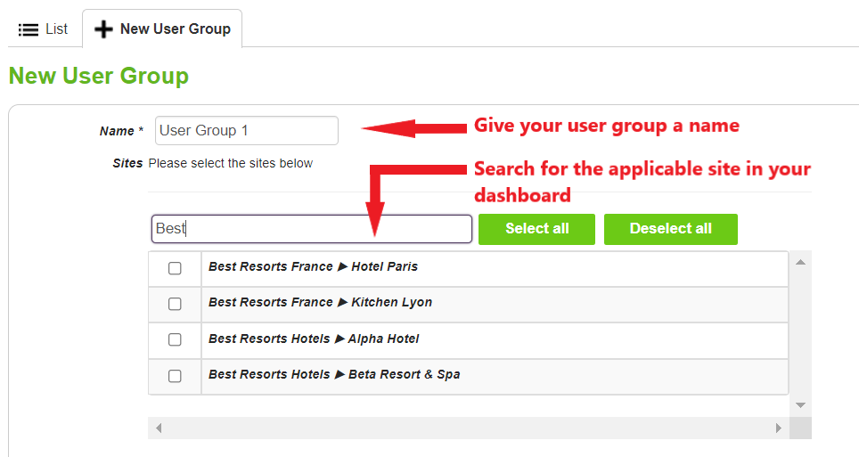 Step 2: Give your 'User Group' a name and select the sites applicable for the user group