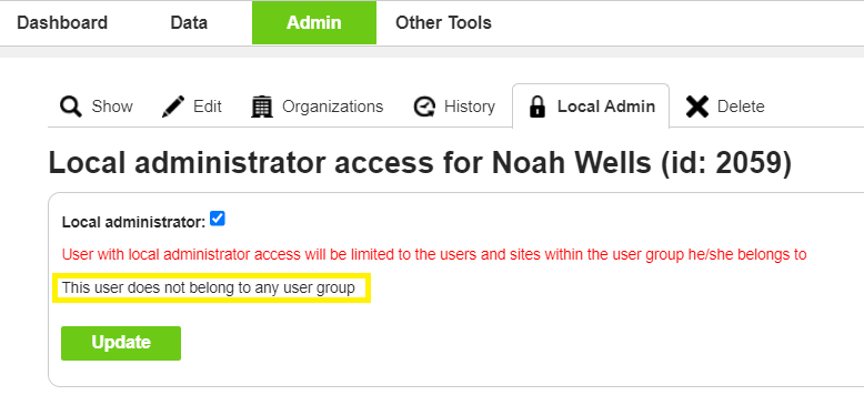 You can now select to make the user a Local Administrator of a group by ticking the box provided and clicking update. If the user is not yet part of a group, you will see a note like the one highlighted below: